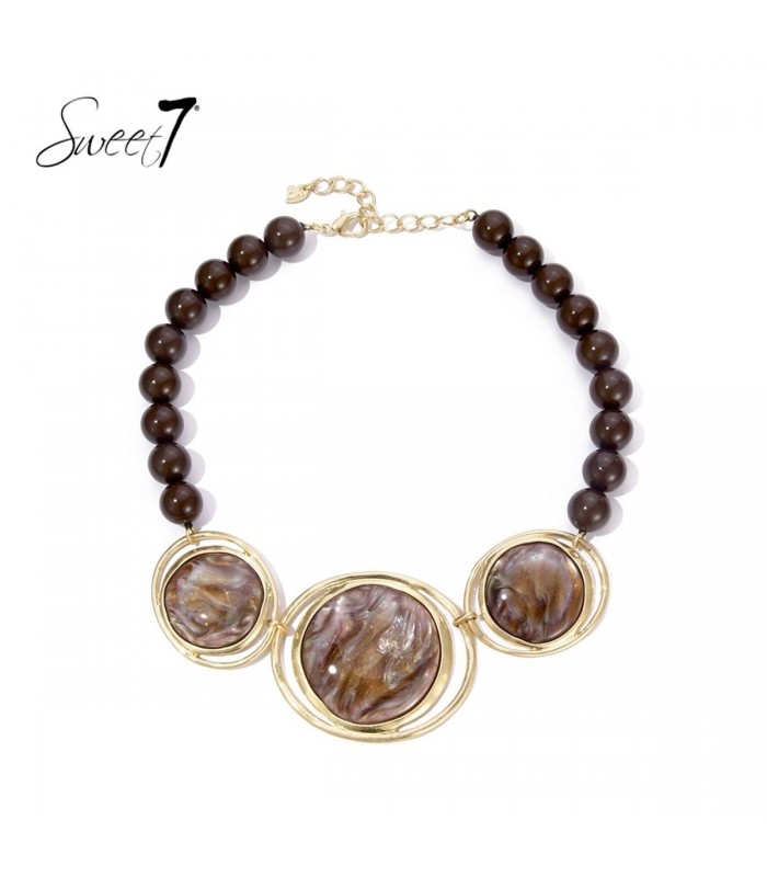Zoek je een statement ketting die warmte en elegantie uitstraalt? Deze bruine halsketting van Sweet7 combineert ronde kralen met drie centrale elementen in marmerlook, omlijst met goudkleurige ringen. De diepe aardetinten zorgen voor een rijke, stijlvolle uitstraling die zowel overdag als s avonds tot zijn recht komt. Rond design met gouden omlijsting De combinatie van glanzende bruine kralen en glimmende goudaccenten geeft deze halsketting een luxe uitstraling zonder te overdrijven. De centrale cirkels trekken de aandacht en geven balans aan elke outfit. Ideaal te dragen boven een blouse of jurkje met V-hals.