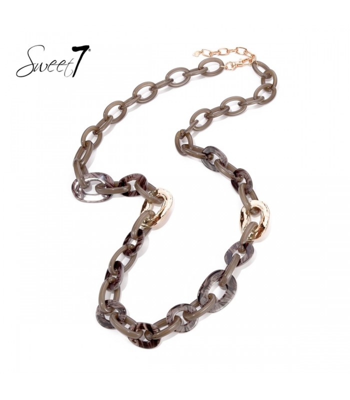 Op zoek naar een eyecatcher die moeiteloos met elke outfit matcht? Deze camel kleurige halsketting van Sweet7 combineert matte schakels met glanzende goudkleurige details voor een speels maar stijlvol effect. De kunststof schakels geven een moderne twist aan elke basic top of jurk. Deze fashion ketting is de perfecte mix van casual en chic. Statement ketting met licht marmer effect De subtiele schakels met marmerlook zorgen voor extra diepte en textuur, terwijl de gouden ovalen elementen een luxueuze touch toevoegen. De verstelbare sluiting maakt de ketting geschikt voor verschillende halslijnen. Combineer met andere trendy sieraden voor een complete stijlupgrade.