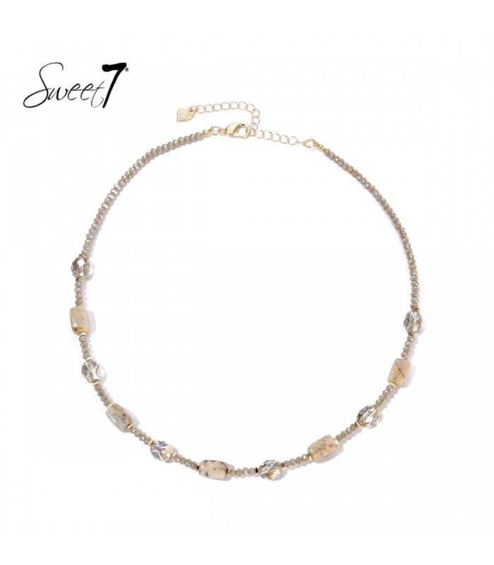 Wil je een halsketting die verfijnd en opvallend is? Deze stijlvolle ketting van Sweet7 mixt transparante facetkralen met beige natuursteenaccenten. De combinatie van neutrale tinten en glanzende details maakt dit sieraad een subtiele blikvanger, perfect voor zowel casual als chique gelegenheden.