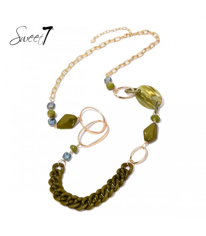 Hoe breng je een natuurlijke tint samen met moderne elegantie? Deze halsketting in olijfgroen met goudkleurige schakels is het antwoord. De grove schakel, kralen en glanzende elementen zorgen voor een speelse balans. Een trendy ketting die elke outfit direct opwaardeert. Vormen die spreken De mix van ovale ringen, facetkralen en chunky schakels maakt dit collier dynamisch en opvallend. Olijfgroen is een echte modetint die zowel bij neutrale als kleurrijke looks past. Deze halsketting geeft jouw stijl een stoere, maar verfijnde twist.