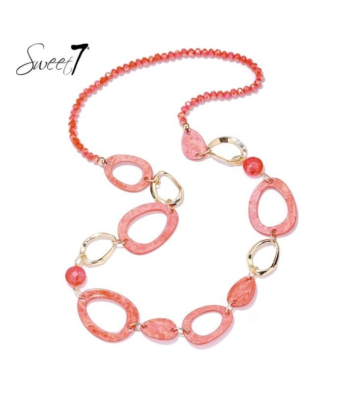 Hoe geef je je outfit in 1 beweging karakter? Deze opvallende halsketting van Sweet7 laat je stralen met levendig koraalrood, gecombineerd met goudkleurige schakels en transparante kralen. De marmerlook elementen zorgen voor een luxueuze twist, terwijl de organische vormen het speels en vrouwelijk houden. Perfect voor wie houdt van kleur en durft op te vallen. De lengte van de halsketting is 98 cm